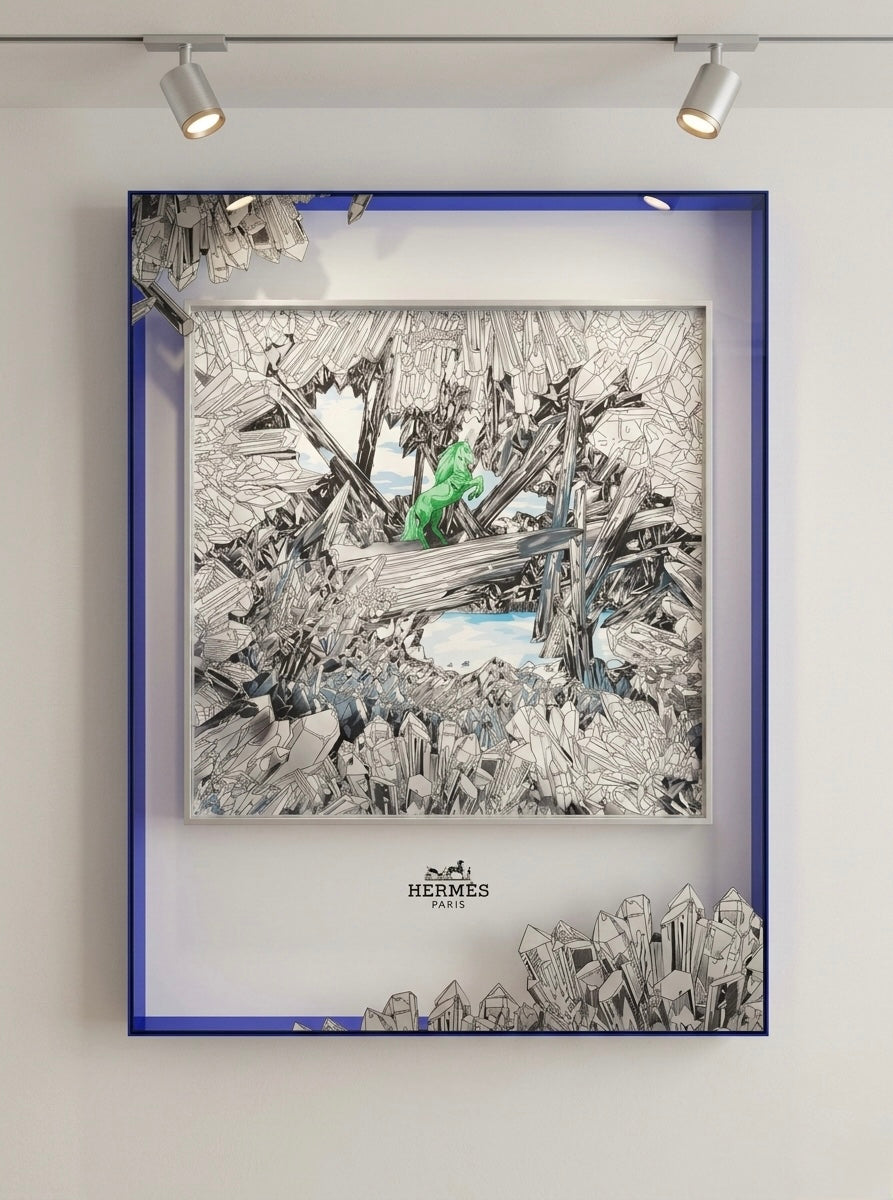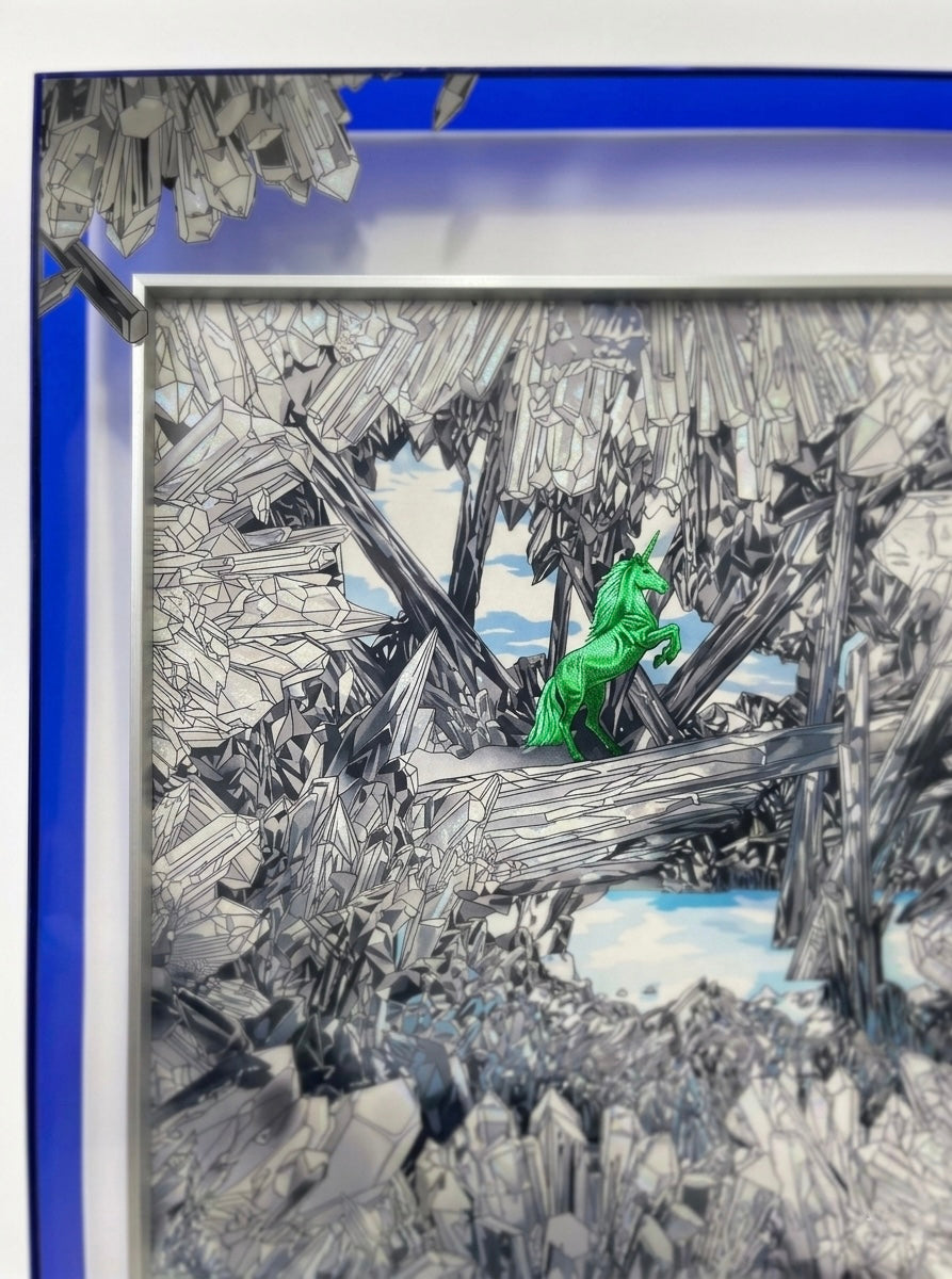 Une œuvre fascinante où l’élégance rencontre l’imaginaire. Au cœur d’un paysage géométrique aux reflets cristallins, les lignes précises et les textures minérales créent une composition à la fois moderne et intemporelle.