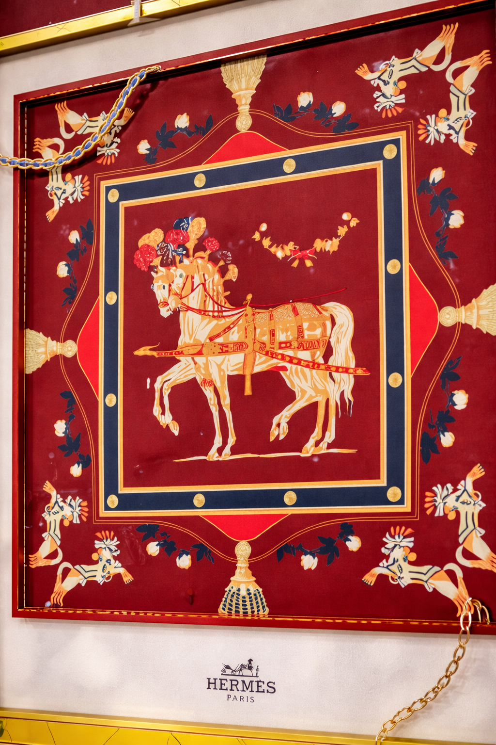 Cette œuvre met en scène un cheval majestueux au centre d’un décor rouge profond, entouré de motifs décoratifs inspirés de l’univers équestre et du design classique. Les détails dorés, les couleurs riches et les éléments graphiques créent une composition visuelle sophistiquée qui attire immédiatement le regard.