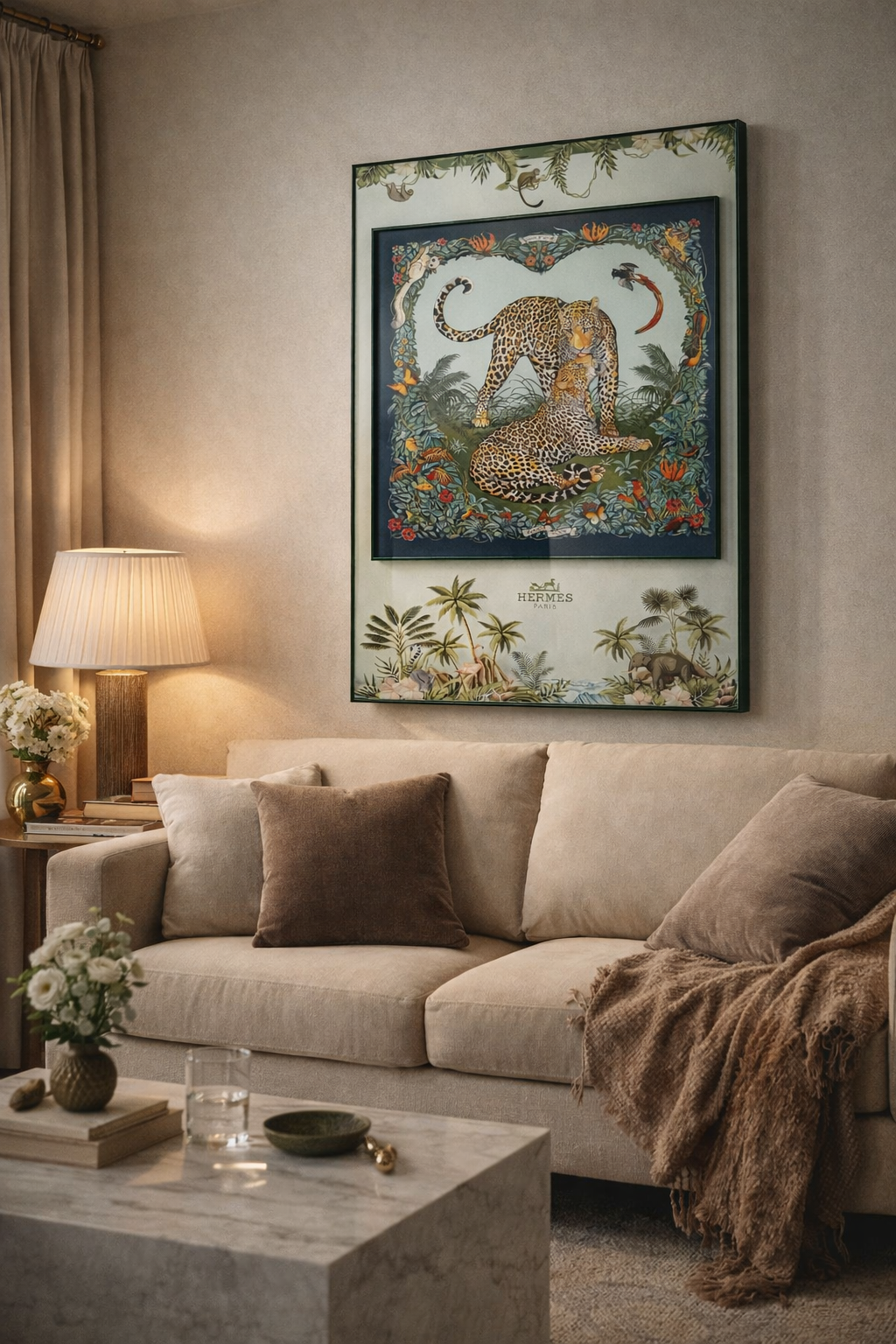Apportez une touche d’évasion et d’élégance à votre intérieur avec ce magnifique tableau inspiré de la nature tropicale. Cette œuvre met en scène deux léopards majestueux entourés d’une végétation luxuriante, d’oiseaux exotiques et d’animaux sauvages, créant une atmosphère à la fois raffinée et immersive.