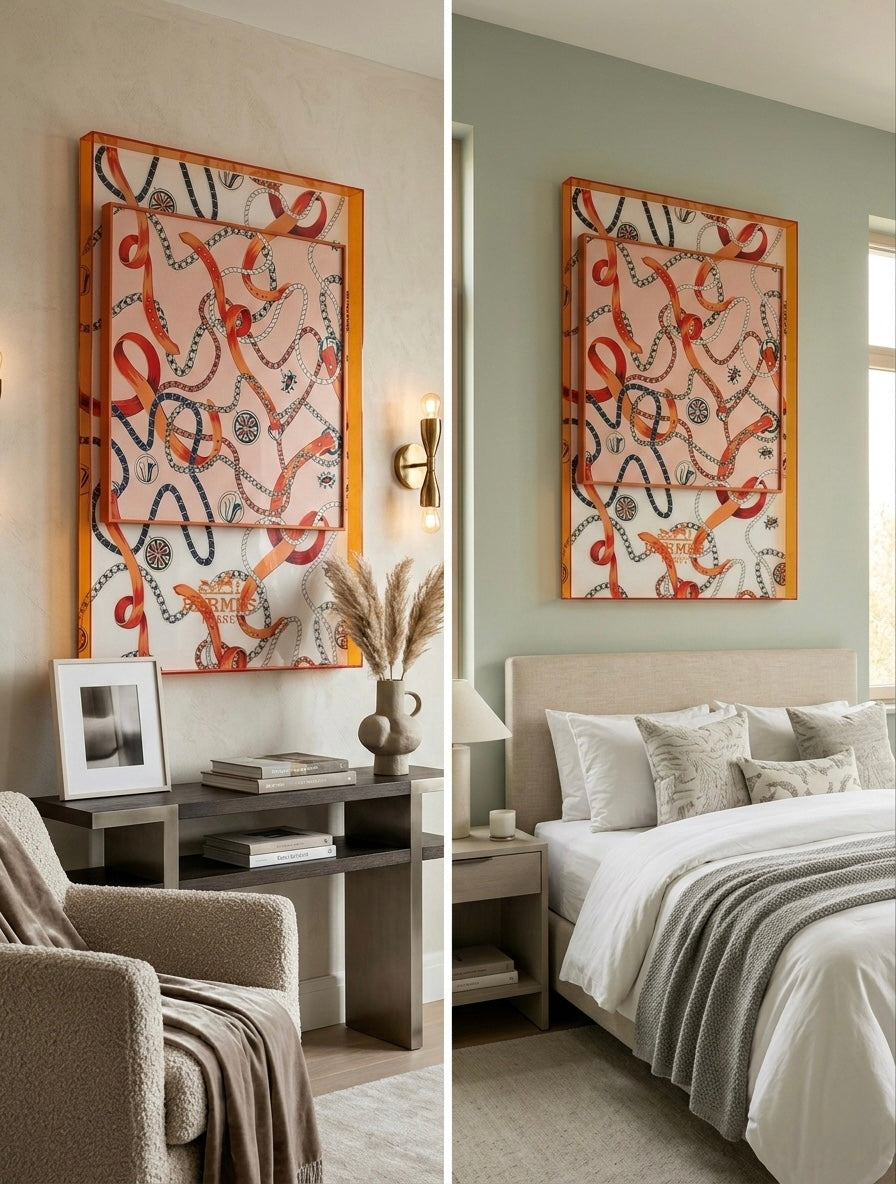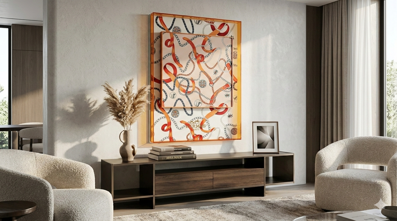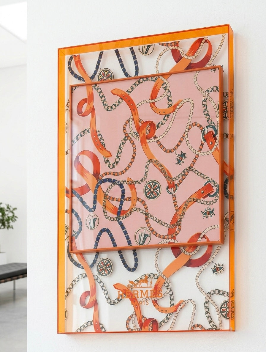 Les teintes chaleureuses d’orange et de corail s’associent à des lignes graphiques sophistiquées pour donner naissance à une œuvre décorative à la fois moderne et intemporelle. Son cadre transparent aux finitions élégantes apporte profondeur et lumière, transformant ce tableau en véritable pièce maîtresse pour un salon, un bureau ou un espace d’accueil.